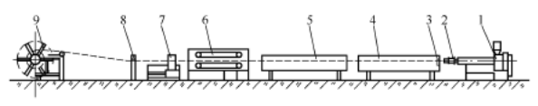 Currently, PVC and PO pipes are the highest volume products both domestically and internationally. Figure 1 shows the production process flow diagram for polyolefin (PO) pipes. Plastic is fed into the annular gap die (2) by the screw as a uniformly plasticized melt, extruding a pipe parison. This immediately enters the calibration unit (3) for cooling and sizing, then undergoes further sufficient cooling in the cooling tank (4). The pipe is pulled out at a constant speed by the adjustable haul-off unit (6), and finally cut to specified lengths by the cutter (7). Thin-walled pipes with diameters below 160mm can be coiled into rolls by the winder (9).