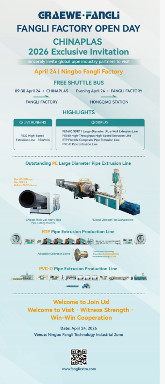 From April 21 to 24 at CHINAPLAS 2026, visit Fangli Technology at booth 7.1C14. Let’s explore innovation and future cooperation in plastic pipe equipment together!